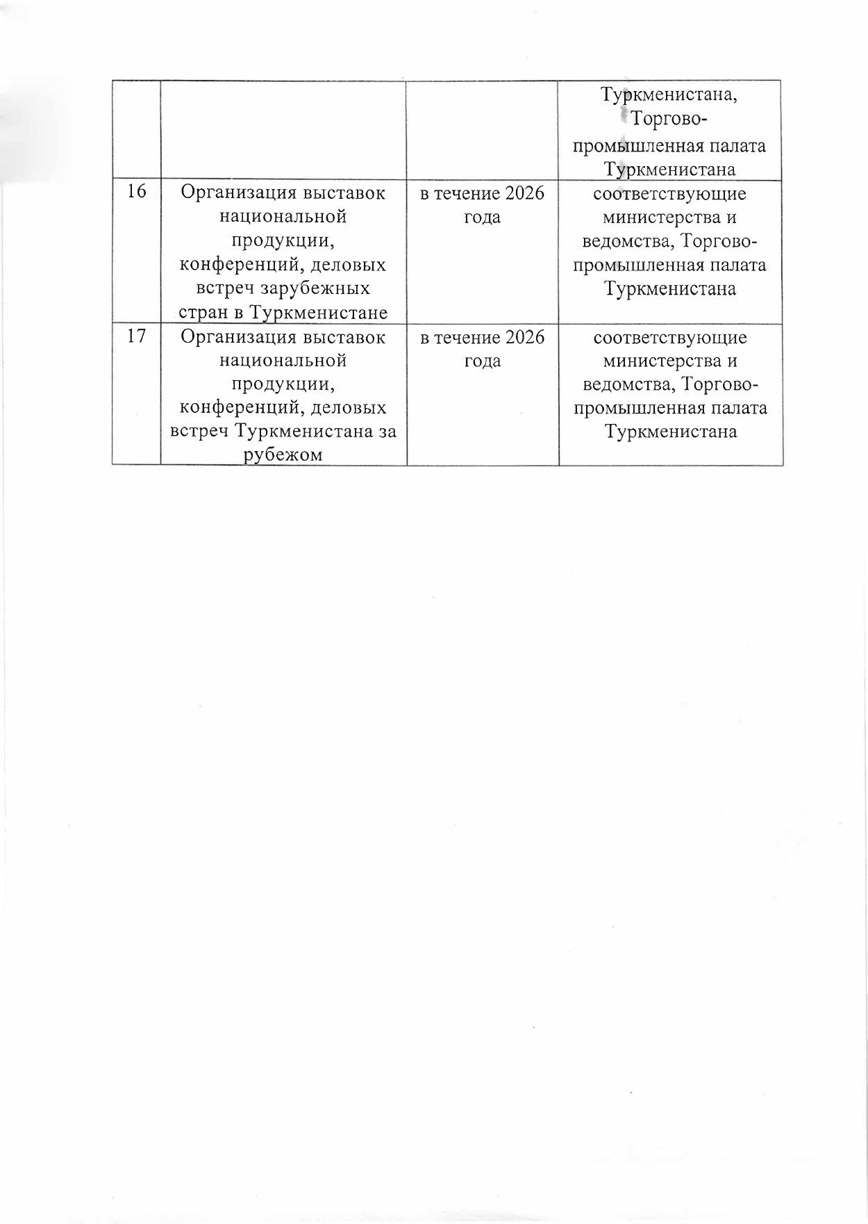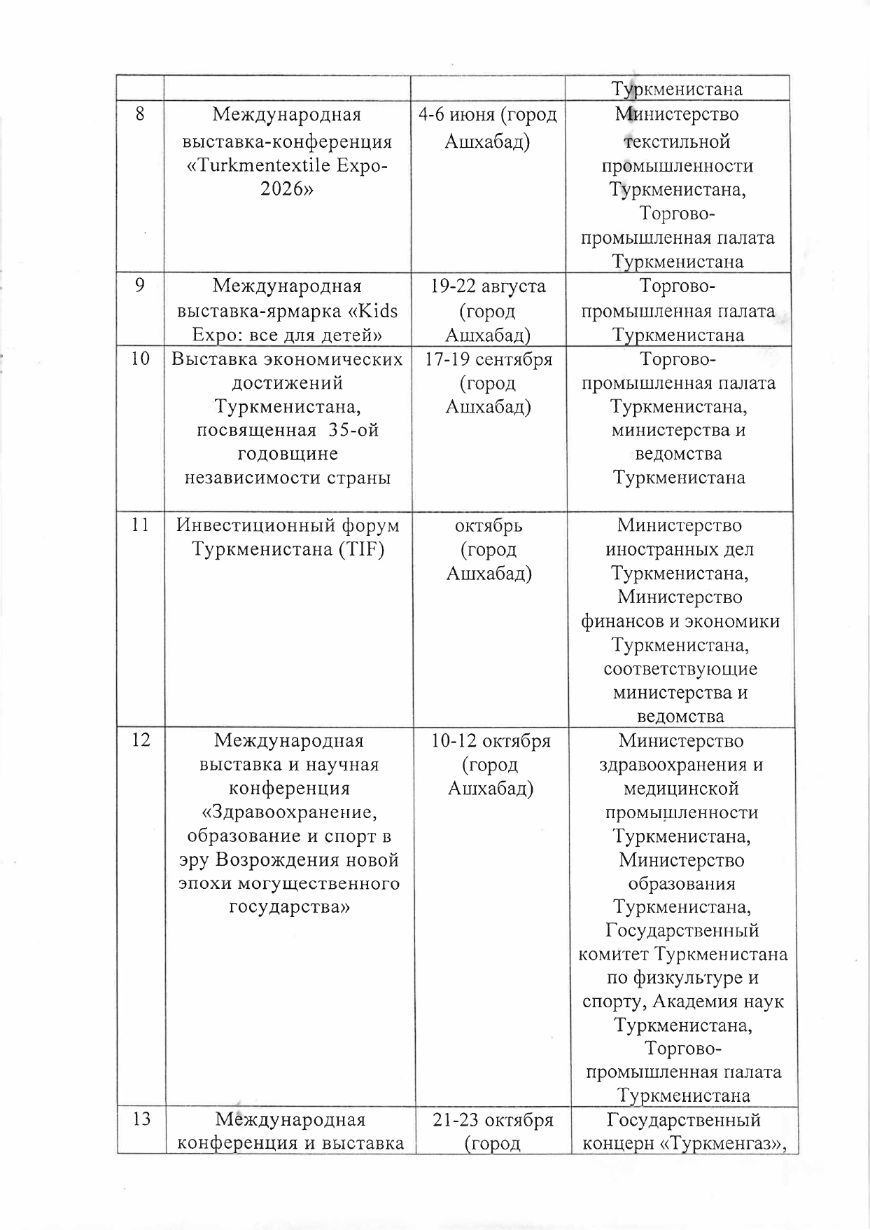 Рӯйхати намоишгоҳҳо, ярмаркаҳо, конфронсҳо ва фестивалҳое, ки аз ҷониби вазорату идораҳои Туркманистон дар соли 2026 ба нақша гирифта шудаанд
