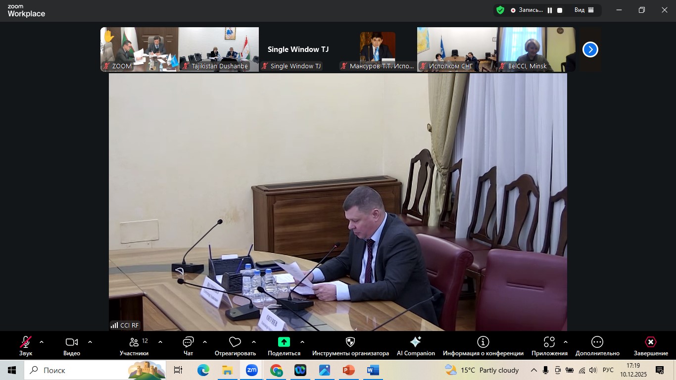 10 декабри соли 2025 дар шакли маҷозӣ аз ҷониби Палатаи савдо ва саноати Ҷумҳурии Тоҷикистон Ҷаласаи кории палатаҳои савдо ва саноати давлатҳои иштирокчии Иттиҳоди Давлатҳои Мустақил ташкил карда шуд.