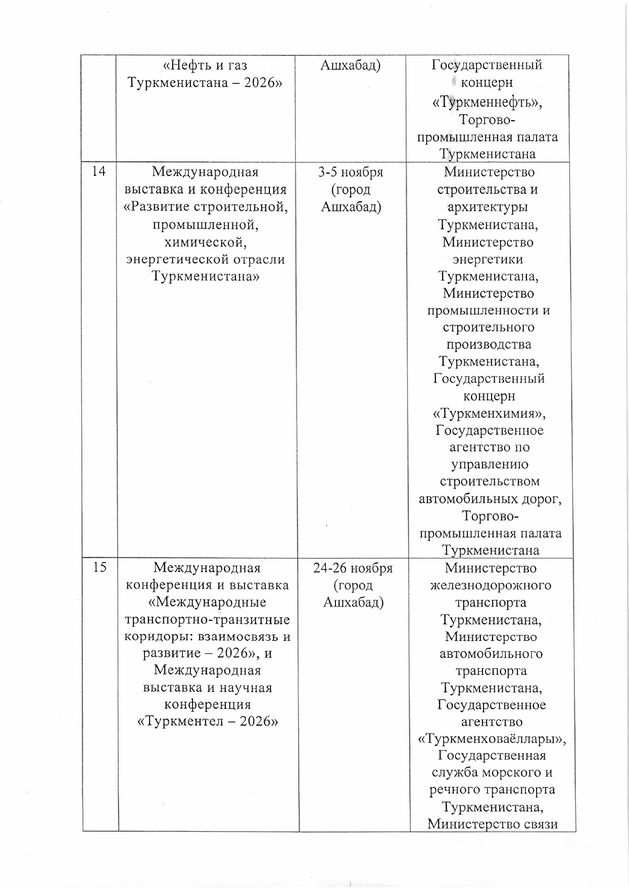 Рӯйхати намоишгоҳҳо, ярмаркаҳо, конфронсҳо ва фестивалҳое, ки аз ҷониби вазорату идораҳои Туркманистон дар соли 2026 ба нақша гирифта шудаанд
