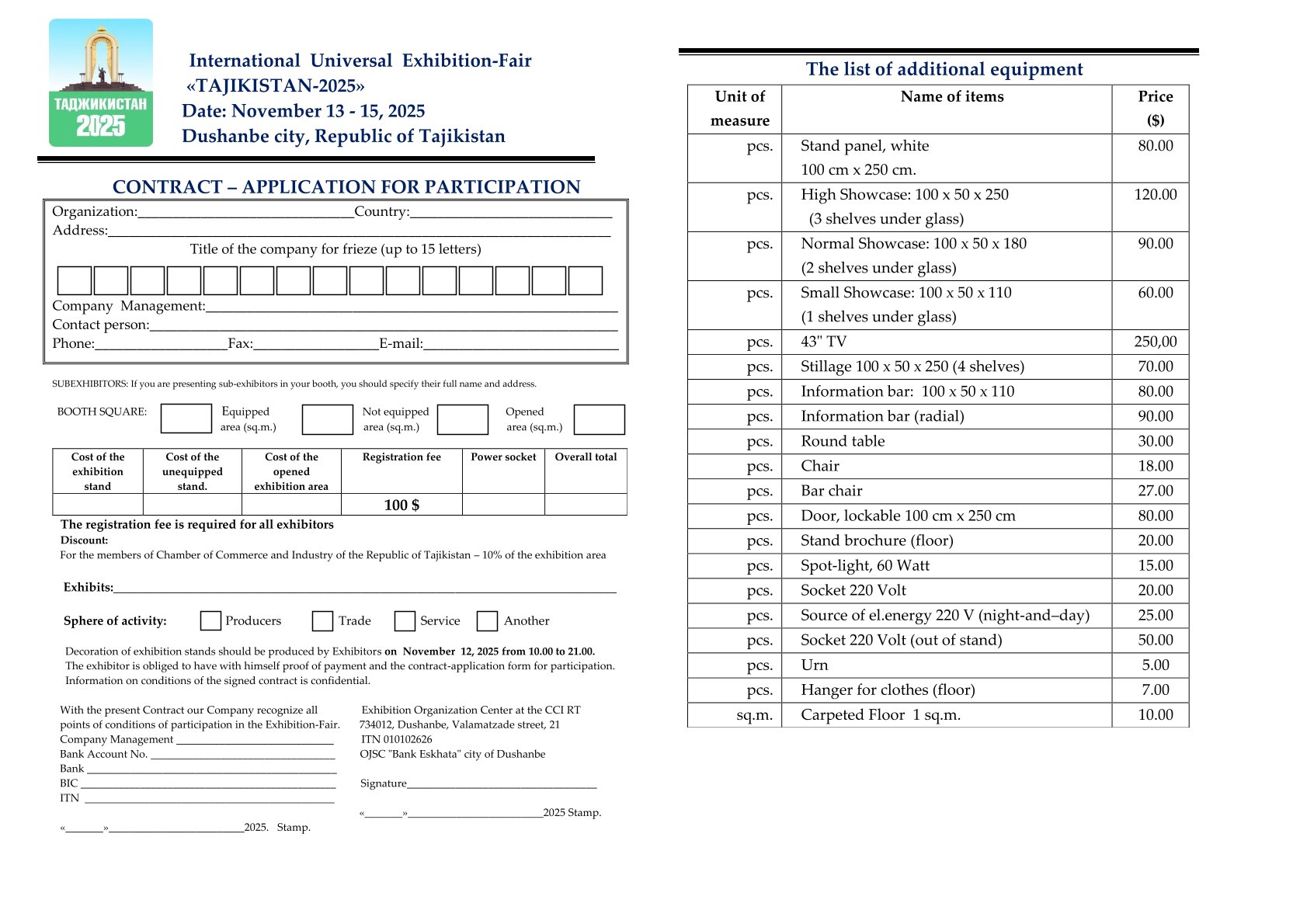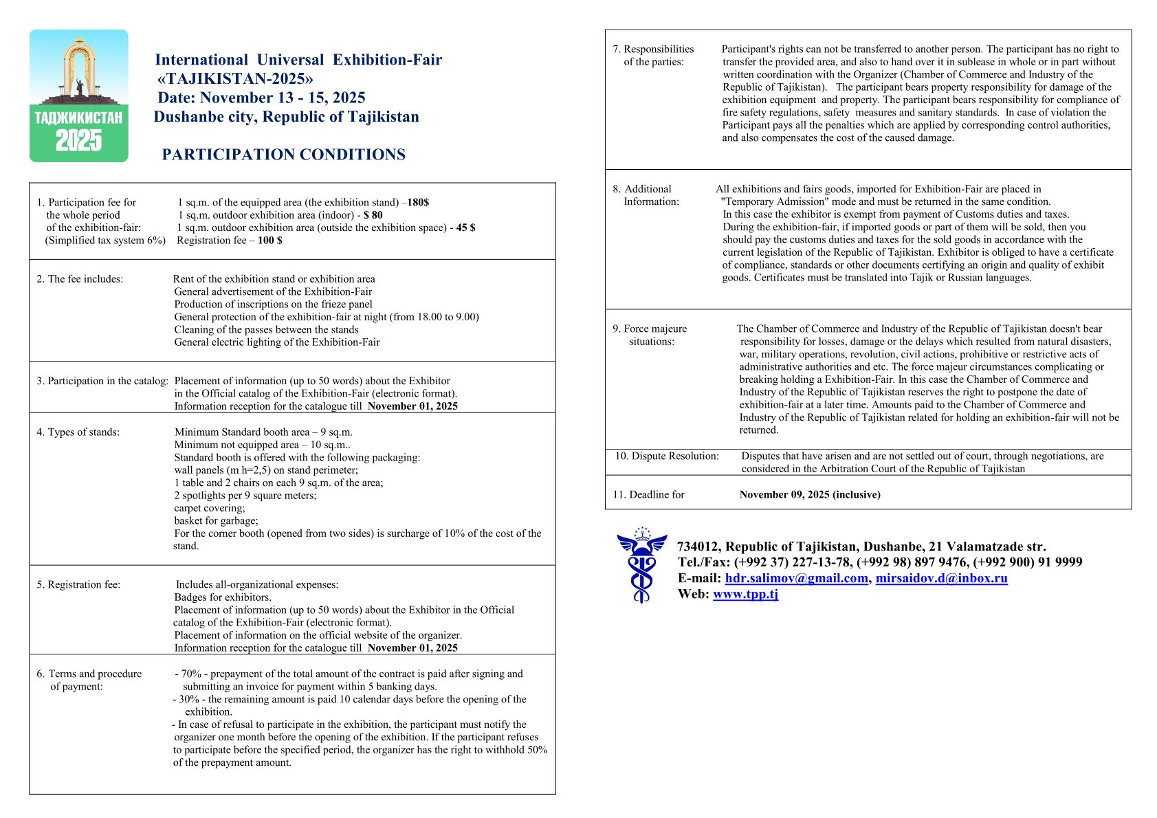 📅 13-15 ноябри соли 2025 Намоишгоҳи байналмилалии универсалии «Тоҷикистон-2025» 🌍 Дар маркази муосири Expo баргузор мегардад, чорабинӣ иштирокчиёнро аз саросари ҷаҳон - тиҷорат, инноватсия ва имкониятҳои нави ҳамкорӣ муттаҳид мекунад. 📌 Макон: Expo Center, Душанбе, Тоҷикистон 📞 Тамос: +992 900 91 9999 +992 000 8888 10 ✨ “Ekspo Tajikistan 2025” — платформаи шарикӣ ва пешрафт!
